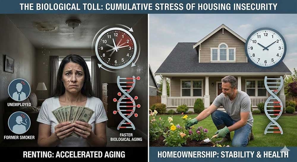 The disparity is stark. The study concluded that the impact of renting on biological aging is double the impact of unemployment and 50% greater than being a former smoker (compared to a non-smoker).